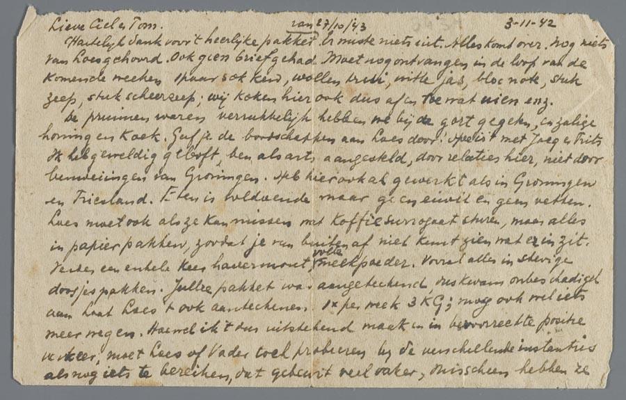 Brief van Max Jacques Roeper uit kamp Vught aan Ciel Verkade-Piekema en haar man Tom Verkade, 27 oktober 1943 en 3 november 1943