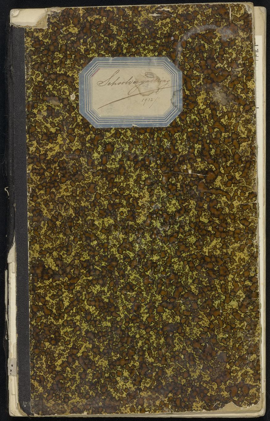 Notulenboek van de Palmgrachtschool in Amsterdam met ingesloten formulier van het CBS m.b.t. ontslag joodse onderwijzers, 1932-1974