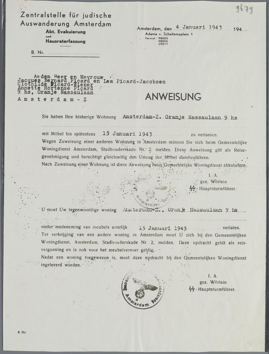 Brief van de Zentralstelle waarin de familie Picard, bestaande uit Jacques Bernard Picard en zijn vrouw Lea Picard-Jacobson, zijn moeder Clothilde Picard-Wiener en zijn zus Anette Hortense Picard. Zij worden gesommeerd hun woning aan de Oranje-Nassaulaan 9 in Amsterdam te verlaten, d.d 4 januari 1943. Getekend door SS-Hauptsturmführer Wörlein.