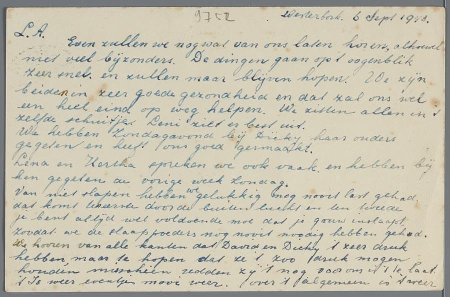 Briefkaart uit Westerbork van Leo en Leni Querido-Levy aan de family Levy in Amsterdam, waarin zij over de dreigende deportatie schrijven, 6 september 1943. Genoemd worden ook David en Dicky, Lena en Bertha (?).