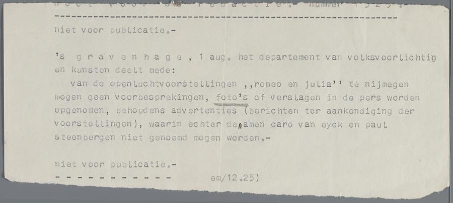 Telexbericht van het Departement voor Volksvoorlichting en Kunsten met het verbod de namen van Caro van Eyck (= Gerarda Taytelbaum), en Paul Steenbergen te noemen, circa 1942