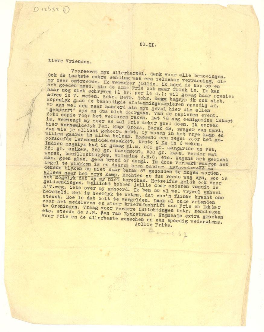 Brief (doorslag) van Frits Benjamins aan 'lieve vrienden', d.d. 21 februari 1944 en overlijdensverklaring van het Rode Kruis m.b.t. Fits Benjamins, d.d. november 1951