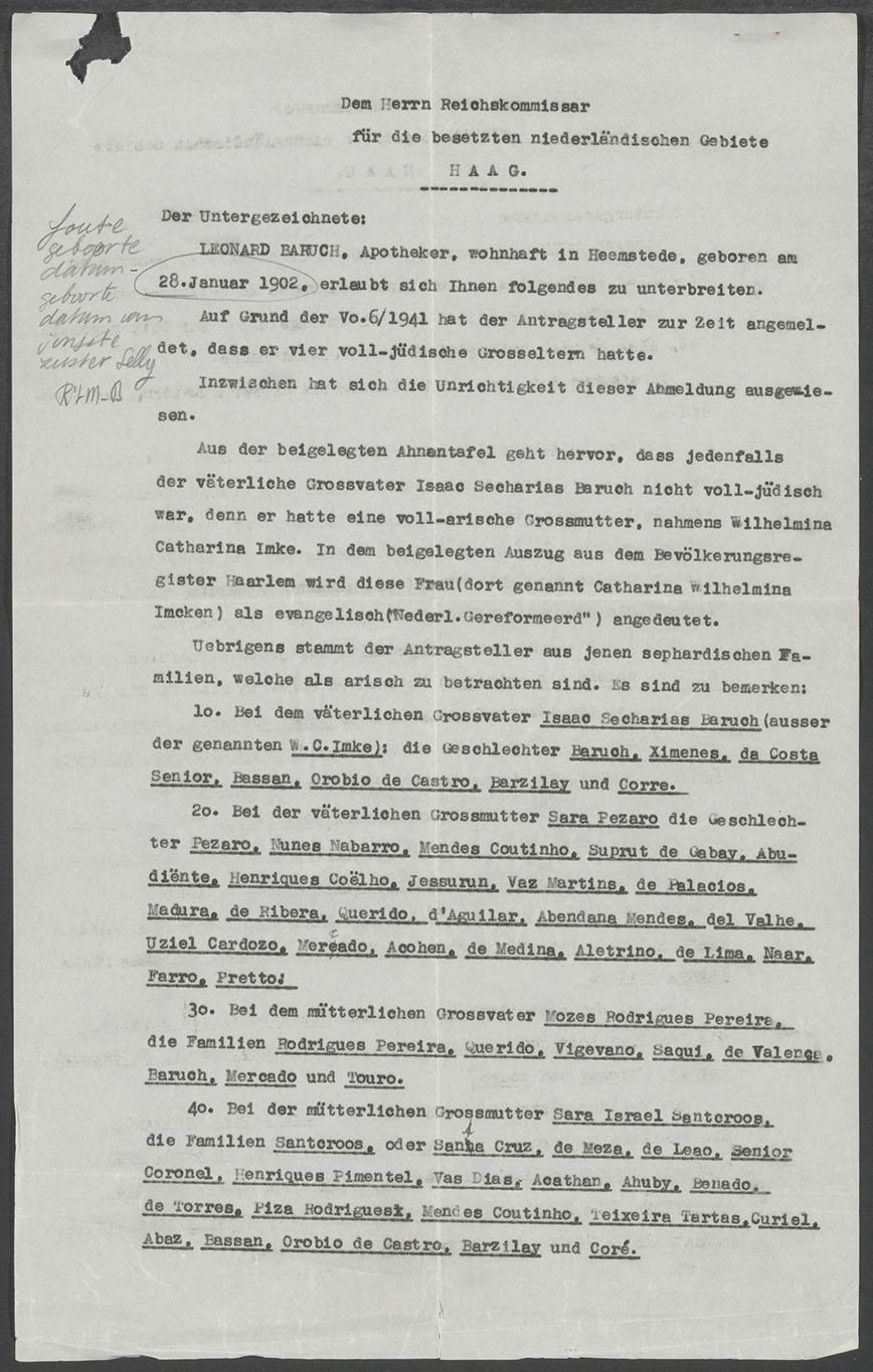 Dossier met afstammingsonderzoek van de families Baruch en Rodrigues Pereira, 1942