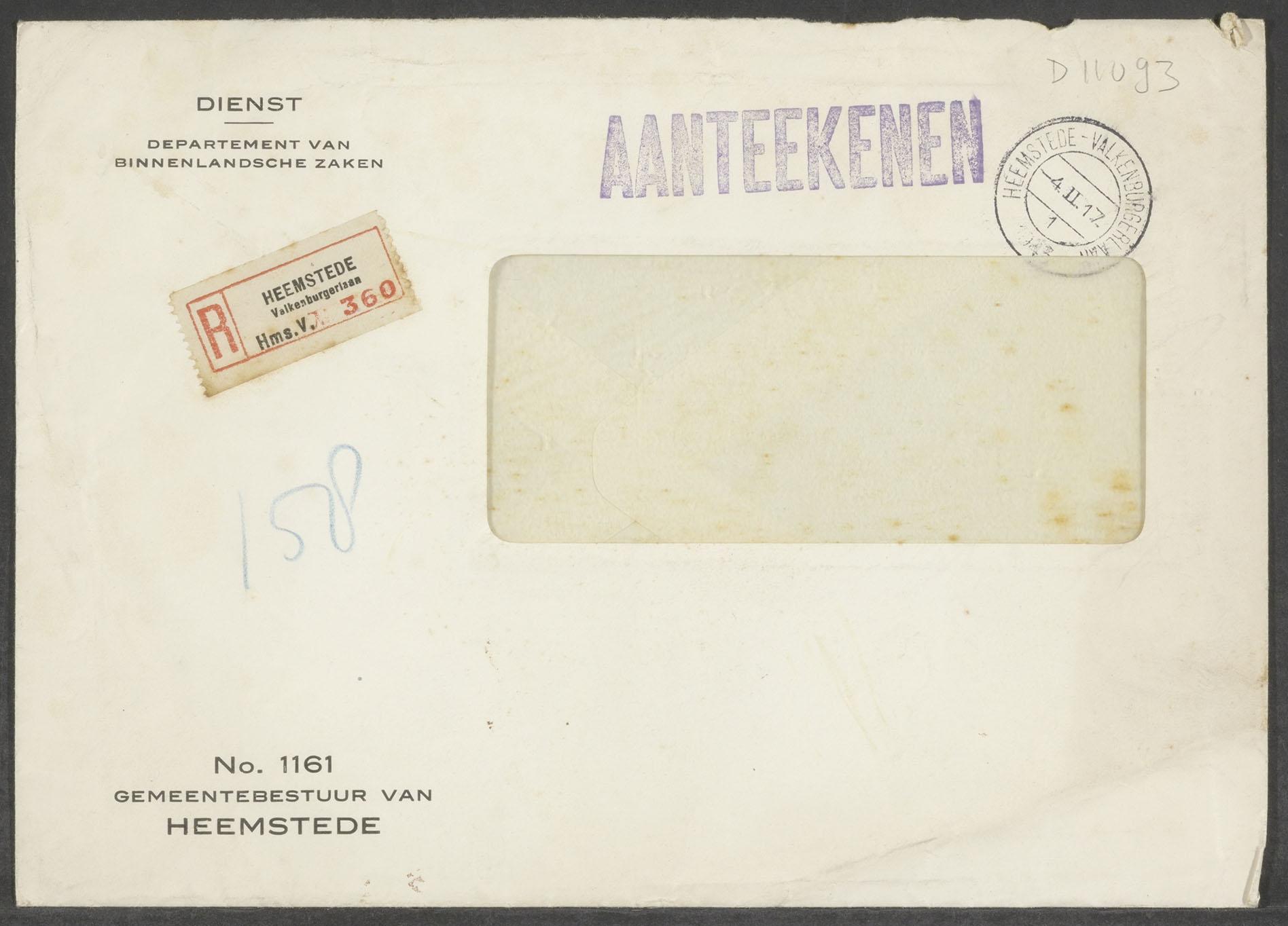 Aangetekend schrijven van de Burgemeester van Heemstede geadresseerd aan L. Baruch in Heemstede in verband met de verplichte evacuatie van joden, 1943