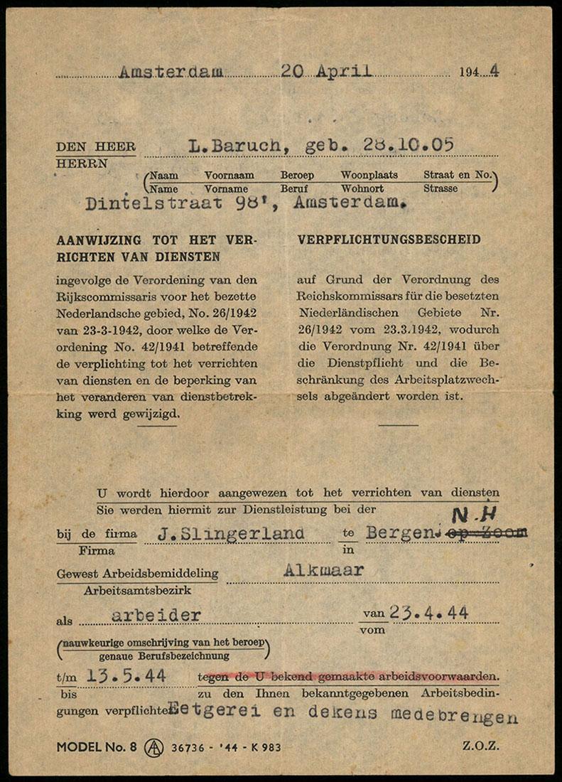 Kennisgeving aan L. Baruch dat hij is tewerkgesteld bij de firma J. Slingerland in Bergen (NH) en dat hij zich moet melden op het Centraal Station in Amsterdam, 1944