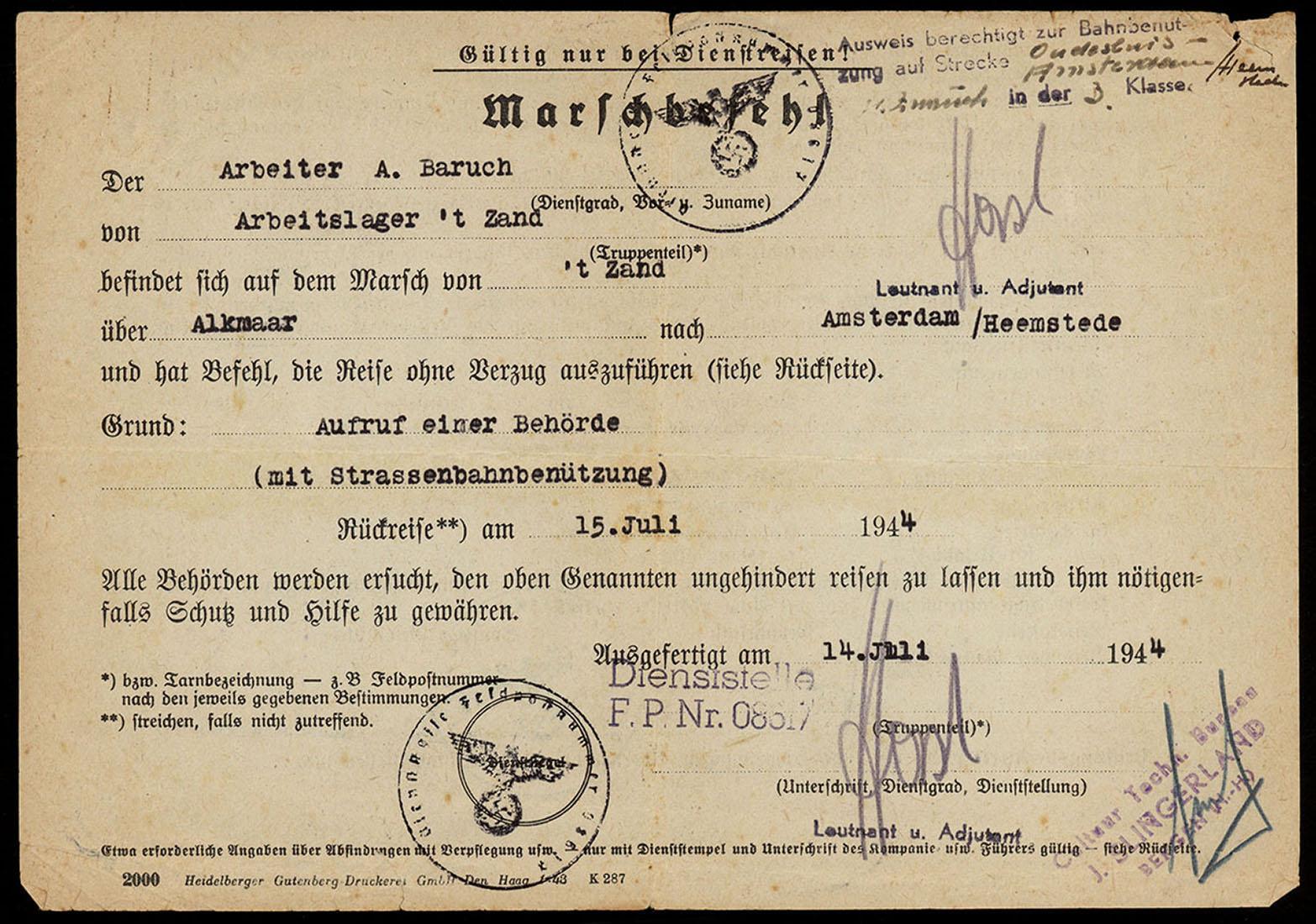 Reisvergunning voor L. Baruch om zich van werkkamp 't Zand naar Amsterdam te begeven, 1944