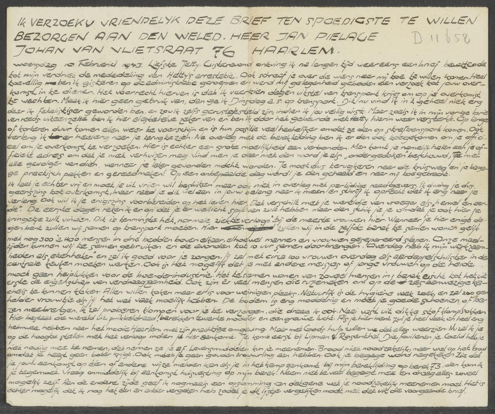 Brief van Emile Frank uit Westerbork aan zijn vrouw Henriette (Jetty) Frank-Swaab via de heer Jan Pielage in Haarlem, o.a. over uitstel van transport, 1943