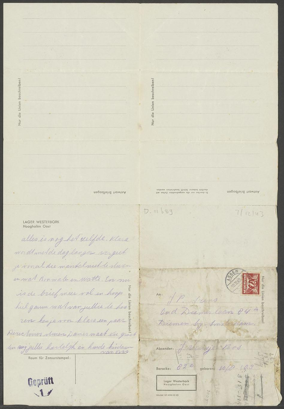 Brief van Jeanette Vuisje-Bos uit kamp Westerbork aan de familie J.P. Arens in Diemen, 7 december 1943