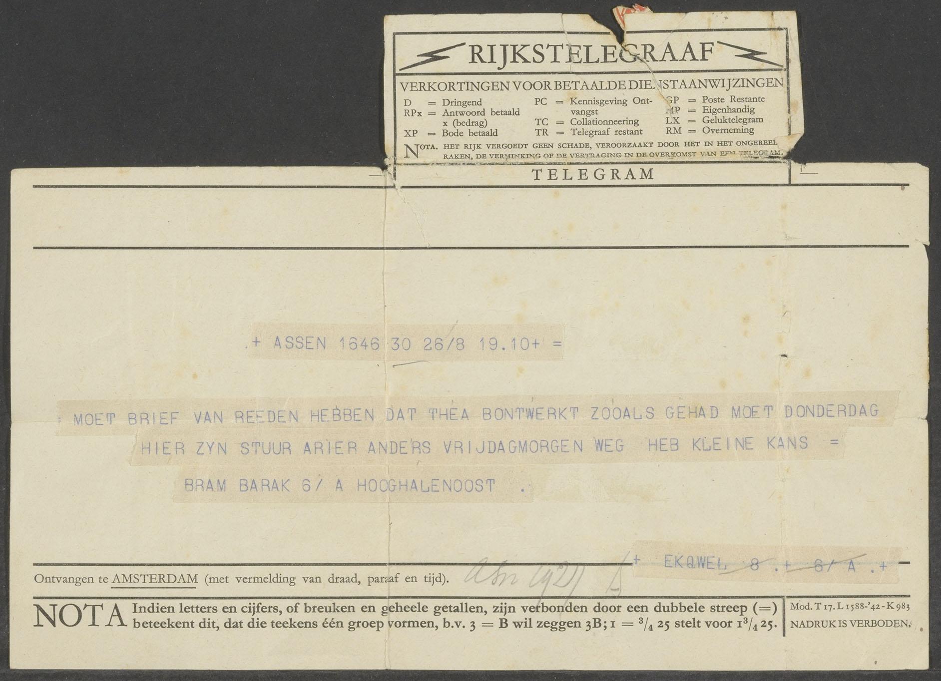 Telegram dat Abraham Sweijd vanuit Westerbork (Assen) stuurde aan zijn zwager met dringend verzoek snel documenten te sturen die misschien deportatie vanuit Westerbork kunnen uitstellen, 1942