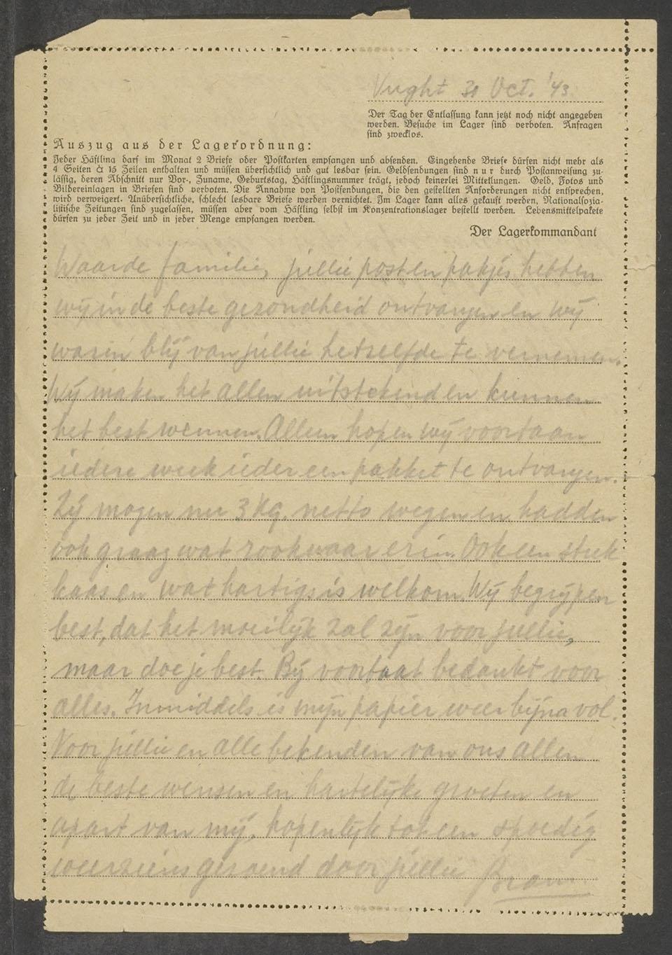 Brief van Abraham Marcus vanuit kamp Vught aan de familie van Gich in Rotterdam, oktober 1943