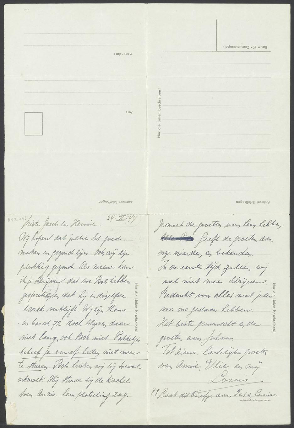 Brieven (3) die Louis Blanes vanuit Westerbork stuurde aan zijn broer Jacob en diens vrouw Henny, 1943