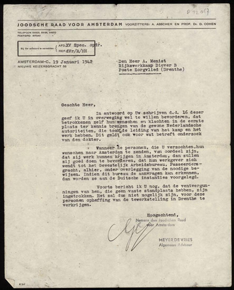 De Joodse Raad antwoordt via A. Menist op verzoeken van tewerkgestelden om terug te mogen keren naar Amsterdam, en op een aanvraag voor muziekinstrumenten zodat in Diever een orkestje kan worden opgezet.