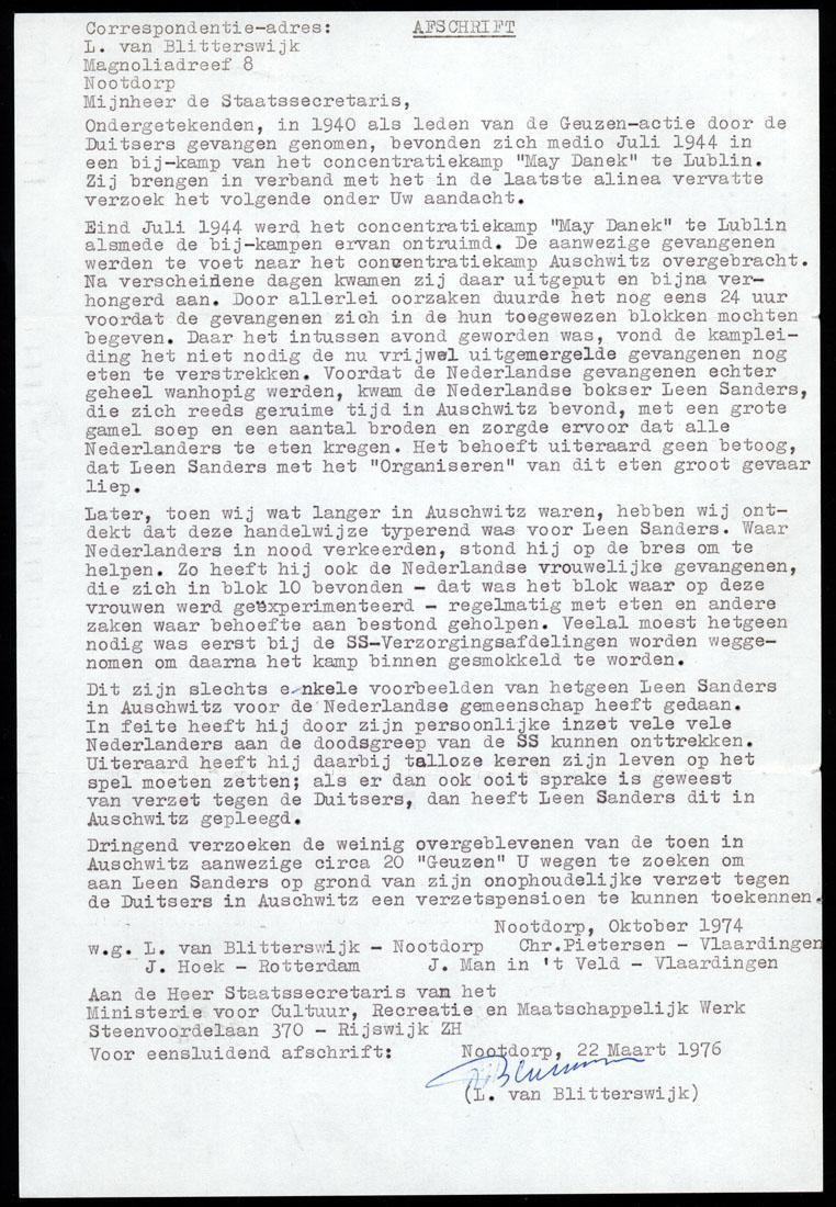 Afschrift van een brief van leden van "de Geuzen" aan de staatssecretaris, waarin ze vragen een pensioen op grond van verzetsactiviteiten toe te kennen aan Leen Sanders, 1976