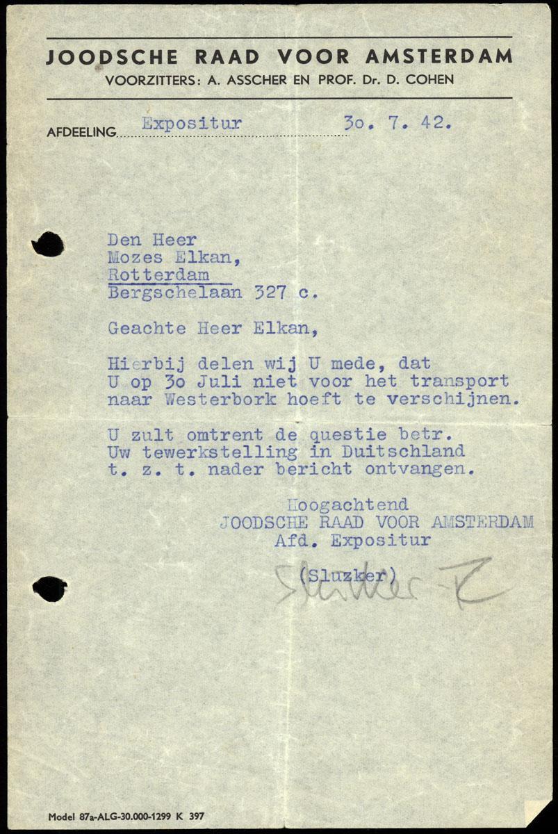 Brief van de Joodse Raad voor Amsterdam aan de heer Mozes Elkan uit Rotterdam dat hij op 30 juli niet voor transport naar Westerbork hoeft te verschijnen, 1942