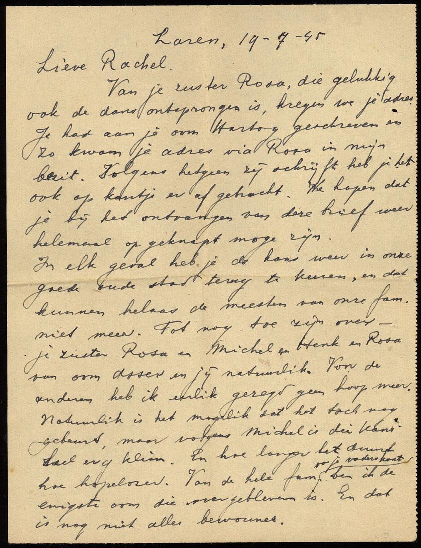 Bevat: - brieven (2) en briefkaarten (2) van Rachel aan Rosa (Ro) Cohen (zus) en Michel Sarphati (zwager). - brieven (2) van onbekenden die Rachel tijdens de periode van repatriering hadden leren kennen. - brief (1) van een in Zweden woonachtige Nederlandse, die Rachel zomaar schrijft. - brieven (4) van Rachels zus Rosa Cohen in Amsterdam. - brieven (4) van verdere familie en vrienden in Nederland. - berichten (2) van de regeringscommissie voor repatriering met informatie over familieleden van Rachel. - persoonlijke aandenkens (kadolabel, blikken medaillon, knipsel van generaal Bernadotte). - deelnemerskaart voor de Amsterdamsche Diamanttentoonstelling 1949.
