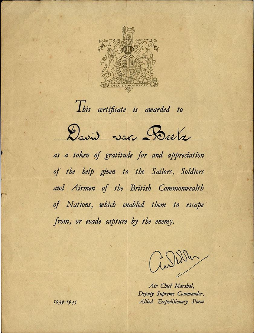 Oorkonde van de Allied Expeditionary Force ten name van David van Beetz uit dank voor zijn hulp aan zeelieden, soldaten en piloten van The British Commonwealth of Nations, 1945