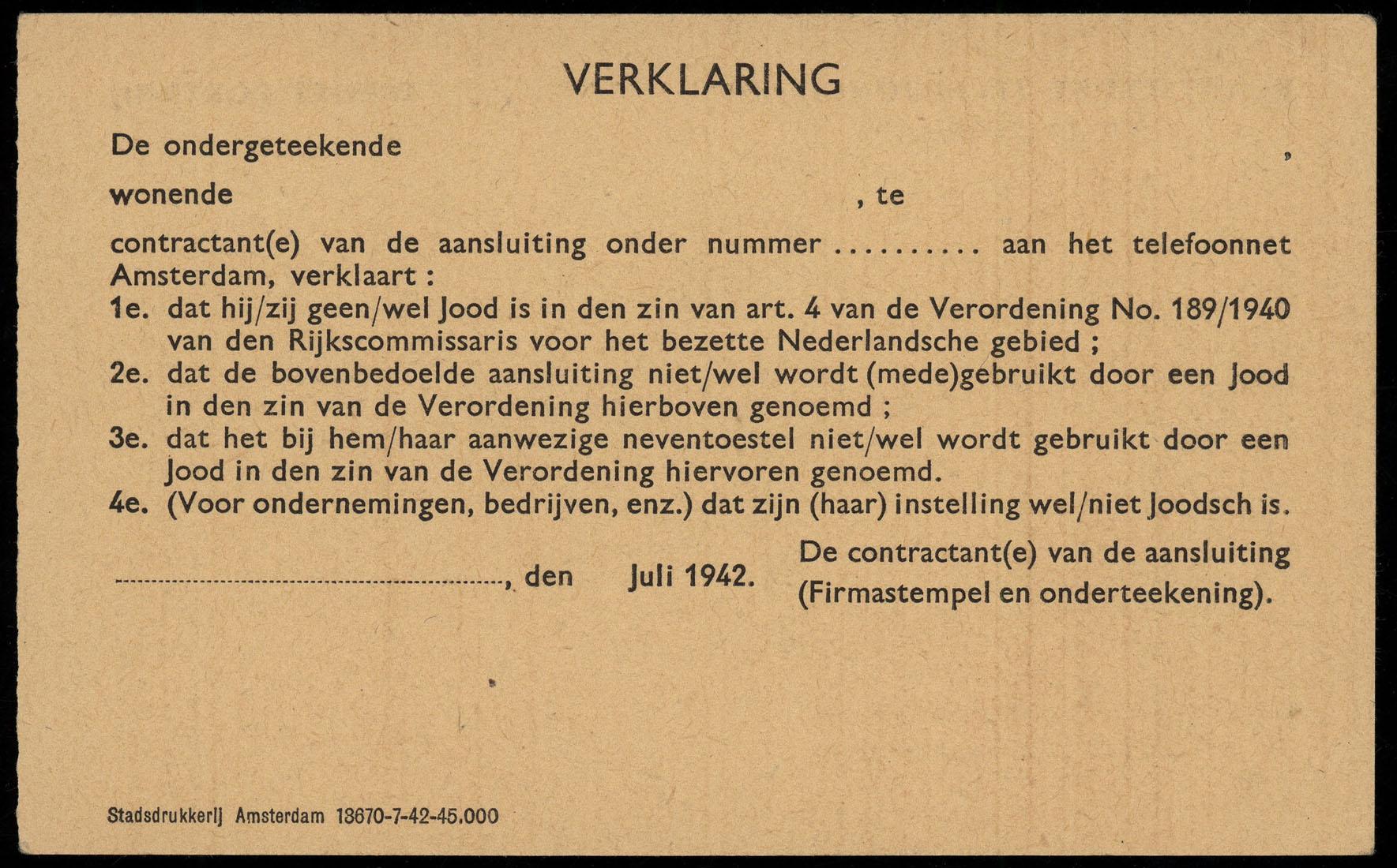 Blanco niet-jood verklaring ten behoeve van de plaatselijke telefoondienst te Amsterdam uit de nalatenschap van Abraham August Konijn (1902-1999), 1942