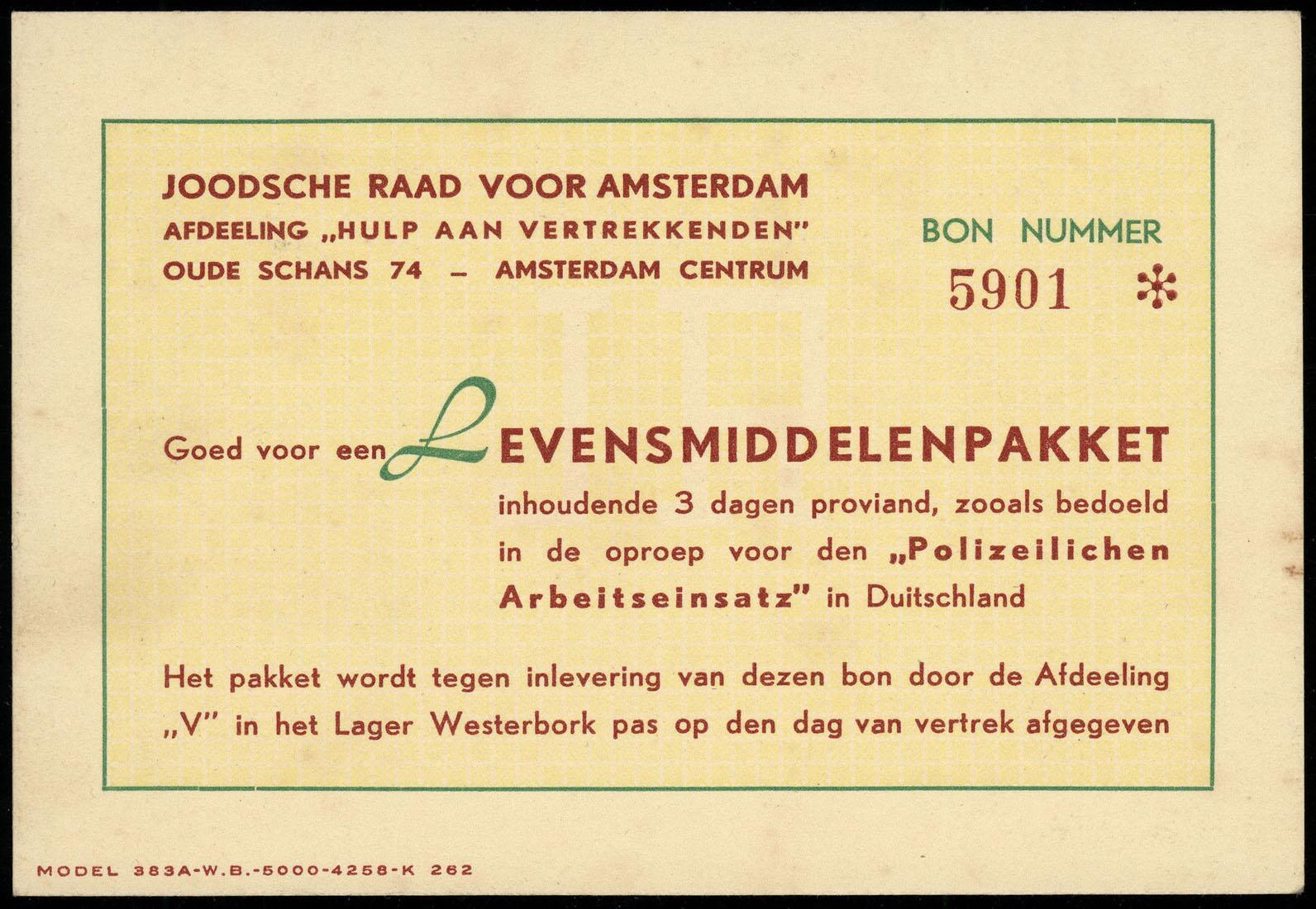 Bonnen (2) van de Joodse Raad, afd. Hulp aan vertrekkenden, voor een levensmiddelenpakket voor gedeporteerden, 1942