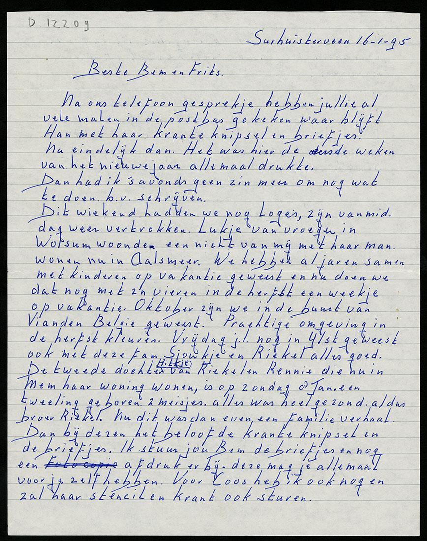 Brief van Han [Bergstra] aan Bernie Poppenburg-Vet vanuit Surhuisterveen over onder andere familienieuwtjes betreffende haar onderduikfamilie Bergsta en een kranteknipsel over de onderduik, 1995