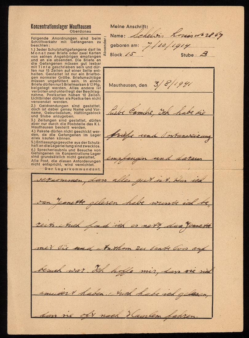 Brief van Louis Schelvis uit concentratiekamp Mauthausen in het Duits, waarin hij zijn vader en zuster feliciteert met hun verjaardag, 1941