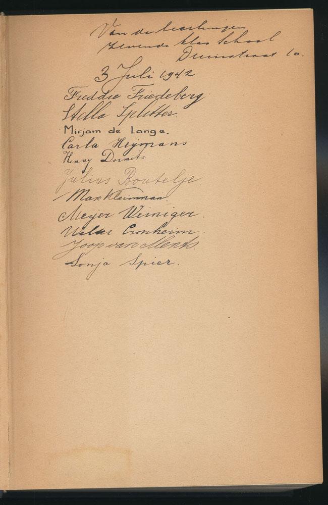 Boek over Nederlands-Indië met voorin de namen van leerlingen van de joodse school in de Duinstraat in Den Haag (of Scheveningen?) die gedwongen de school moeten verlaten, 1942