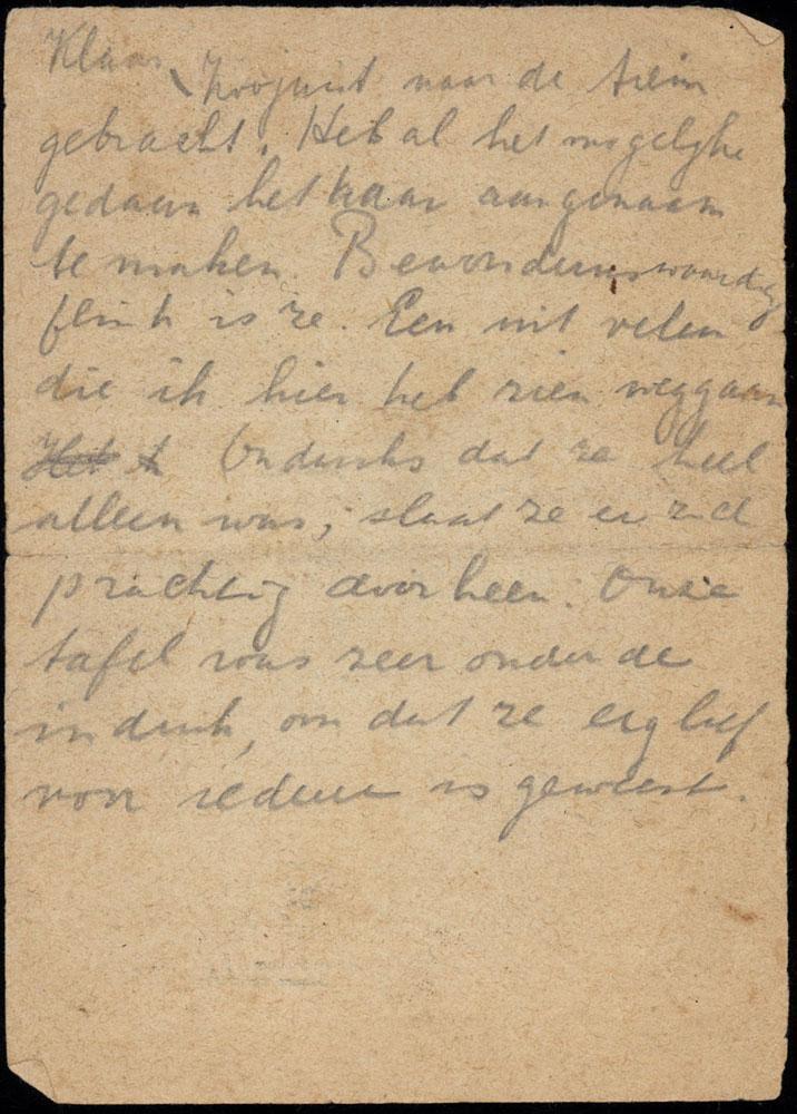 Notitie van Salomon de Zwarte, achterop een vergunningsbriefje van Westerbork, over het wegbrengen en afscheid nemen van zijn schoonzus Klaartje de Zwarte-Walvisch, juli 1943