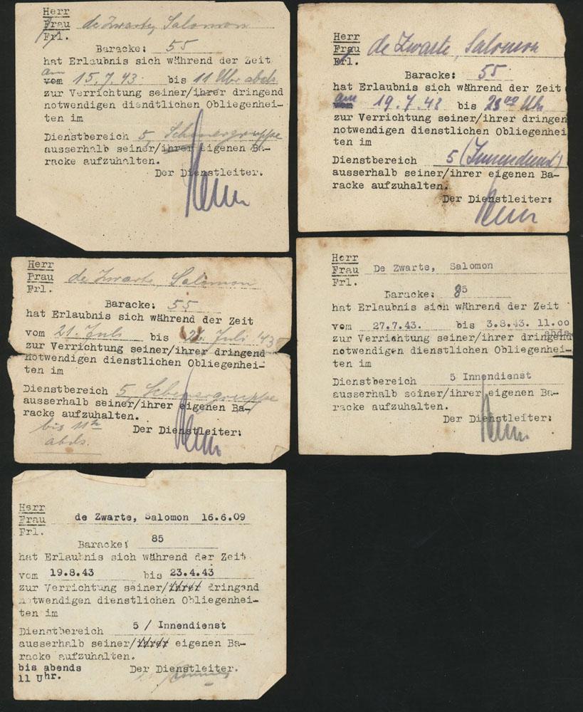 Vergunningen (5) op naam van Salomon de Zwarte, om zich wegens werkzaamheden buiten zijn barak te begeven, kamp Westerbork, juli-augustus 1943