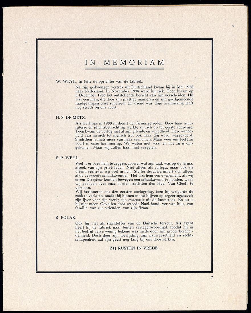 Drukwerk van pyjamafabriek Nobelt in Haarlem met in memoriam van verschillende omgekomen joodse personeelsleden, 1946