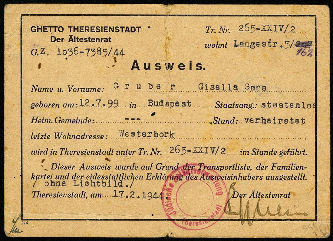Identiteitsbewijs uit Theresienstadt ten name van Gisela Gruber, 1944