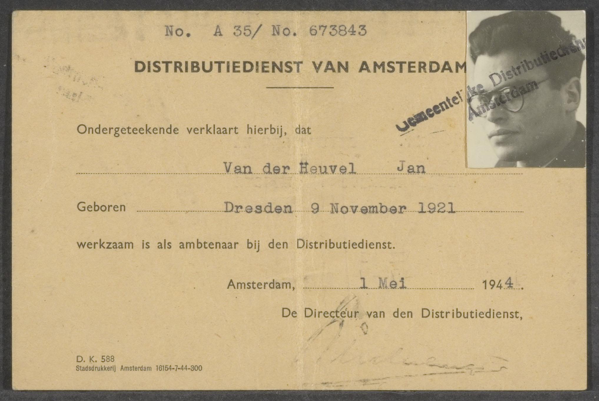 Vervalste verklaring van de Distributiedienst van Amsterdam van Max Gruber op de valse naam Jan van den Heuvel, 1944
