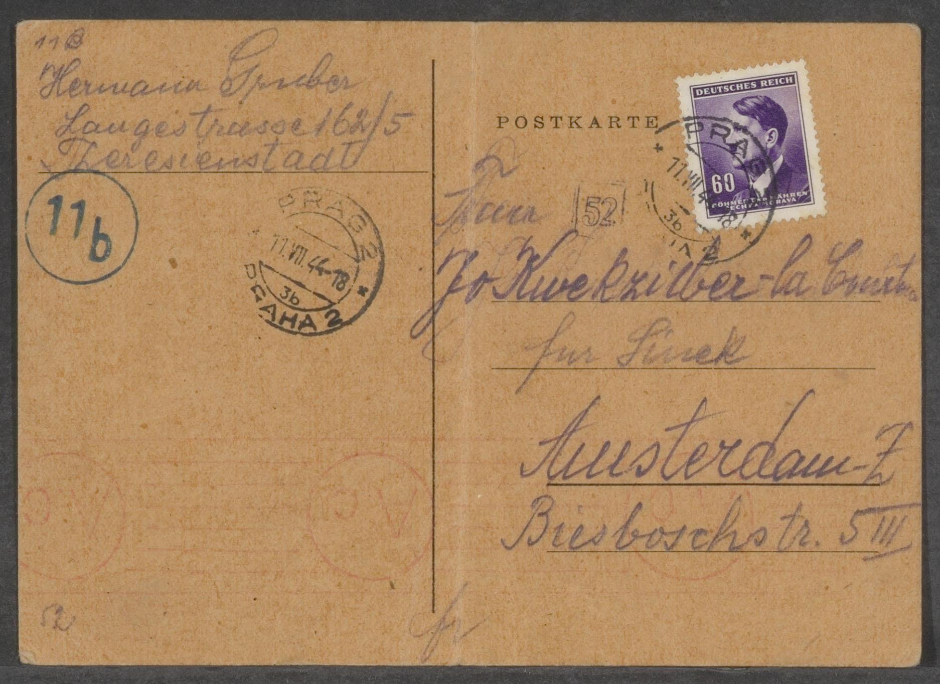 Briefkaart van Hermann Gruber uit Theresienstadt aan Jo Kweksilber-de la Court over de ontvangst van een pakket, 1944