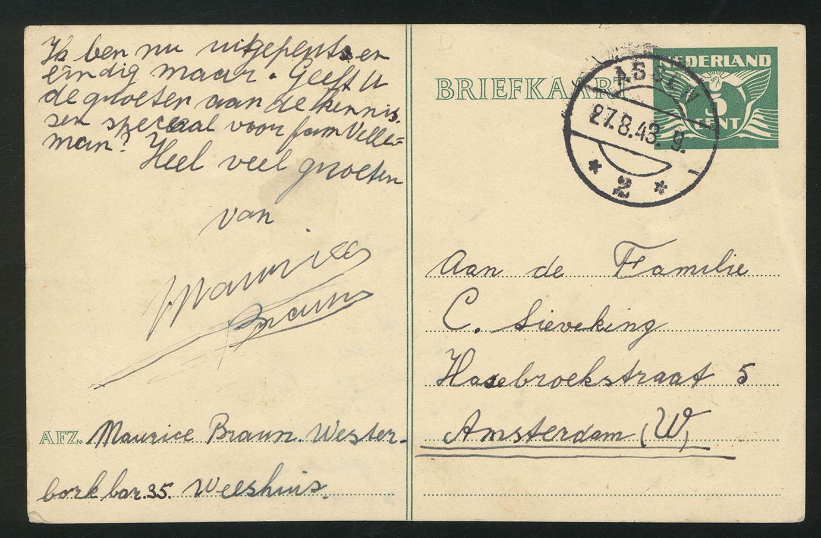 Briefkaarten (2) van Maurice Braun uit Westerbork aan de familie Sieveking in Amsterdam, 1943