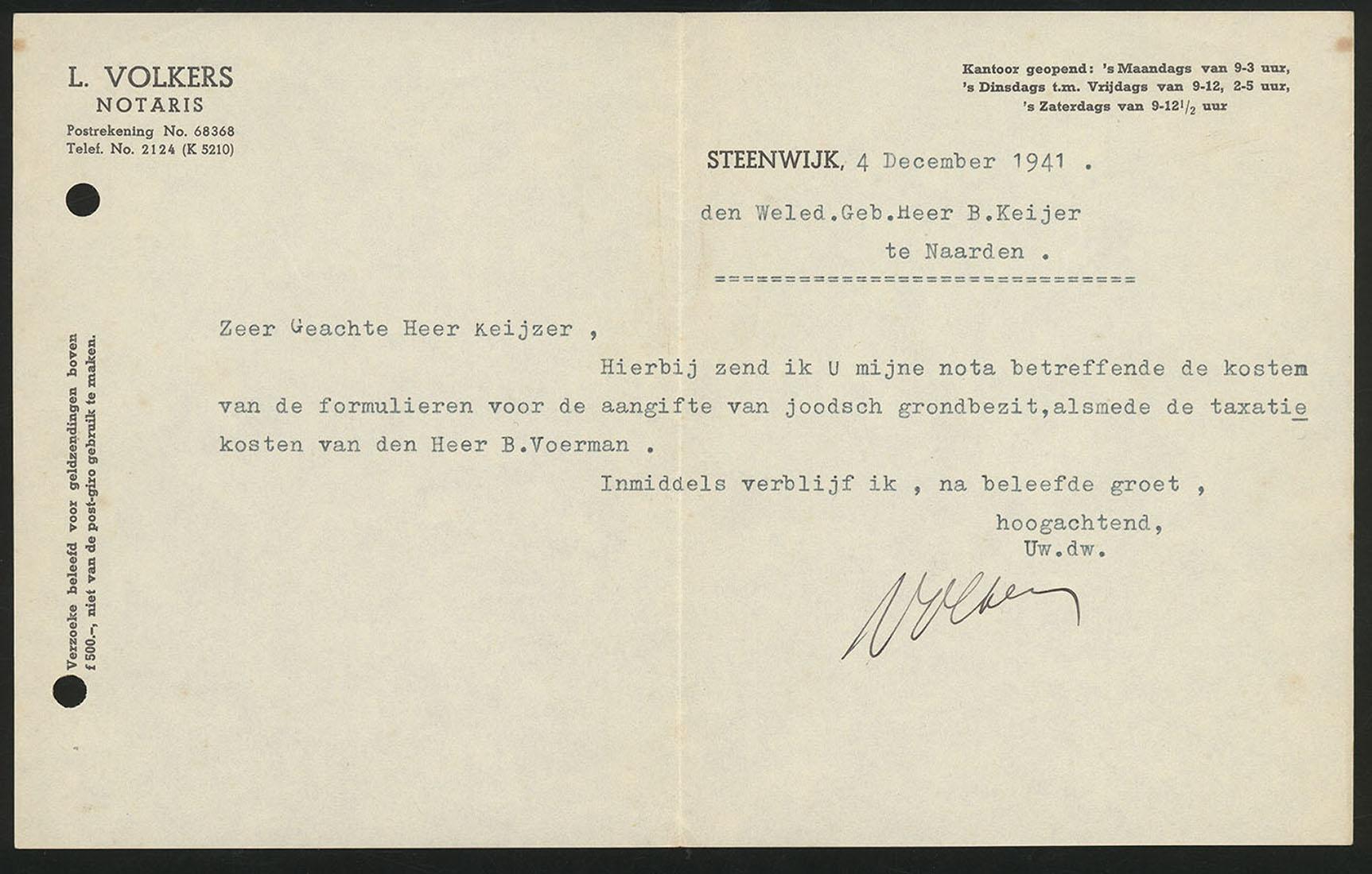 Brief en nota van notaris L. Volkers uit Steenwijk betreffende kosten voor formulieren voor de aangifte van joods grondbezit, 1941