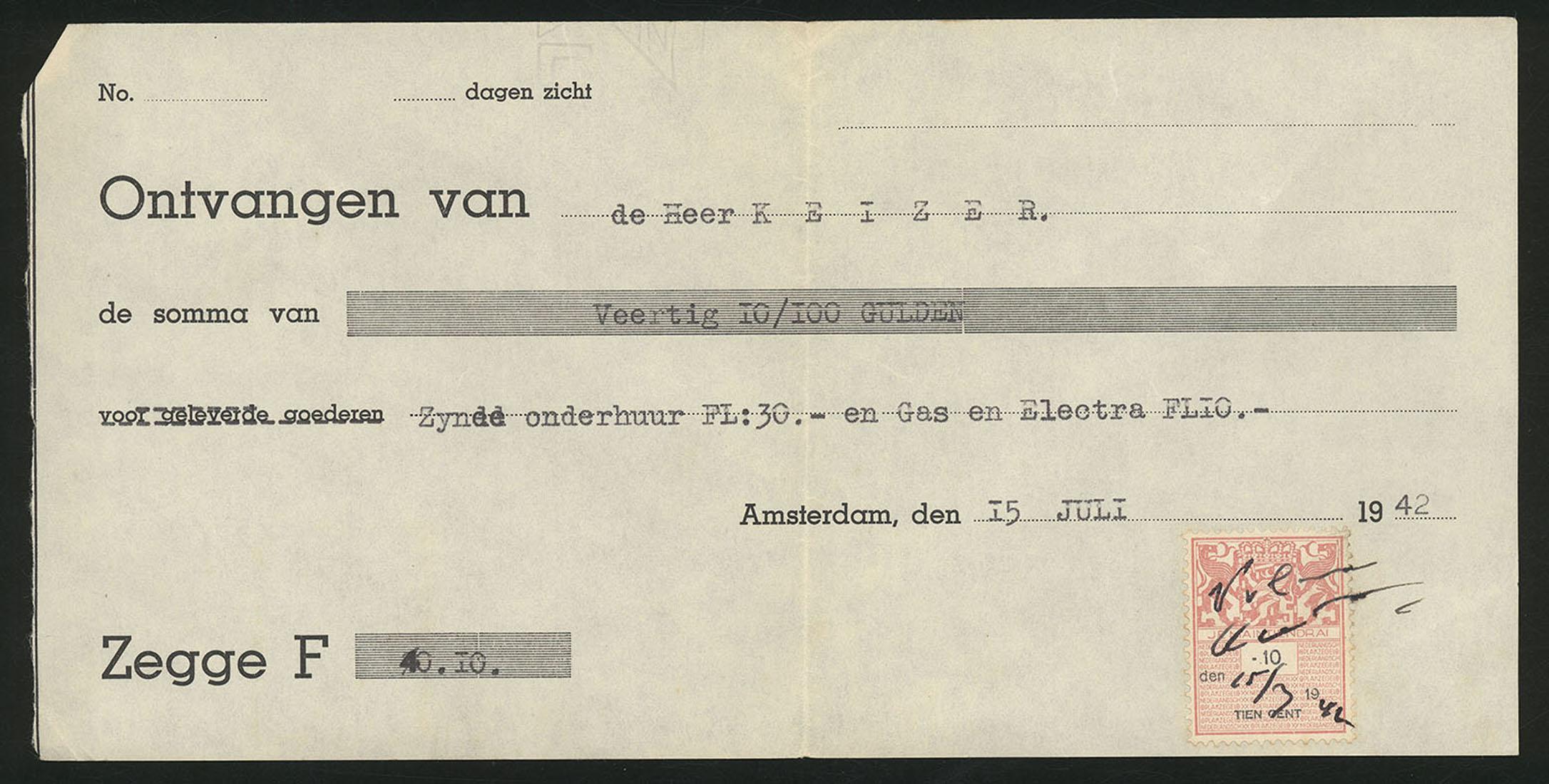 Ontvangstbewijzen (2) ten name van de heer B. Keijzer over betaling van onderhuur en gas en elektra in Amsterdam, 1942
