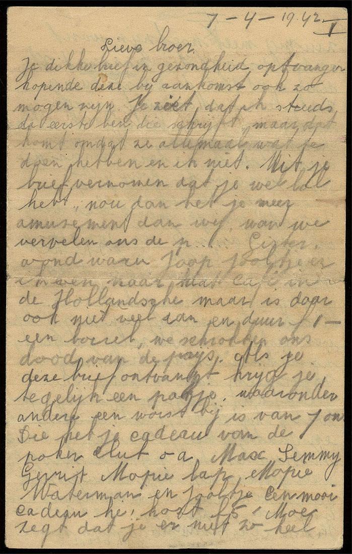 Brief aan Aäron Boeken in het werkkamp Geesbrug van zijn zus Betje Roosje Boeken, zijn broer Jaap Boeken, zijn vader David Boeken en zijn moeder Saartje Boeken-van Oosten, 1942