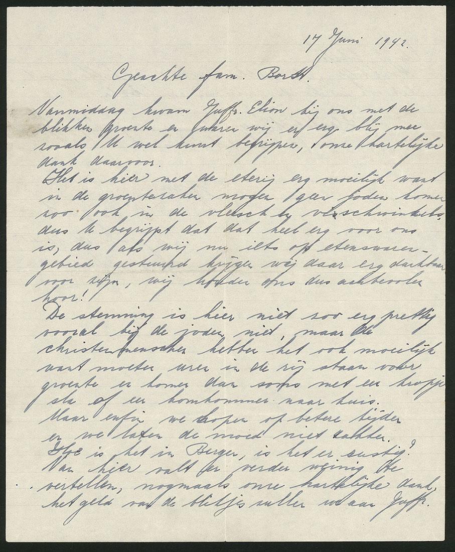 Brief van David de Groot (1879-1943) geschreven na zijn verplichte verhuizing naar Amsterdam aan de familie P. Borst in Bergen (NH) onder andere over het opsturen van voedsel en de anti-joodse maatregelen, 1942