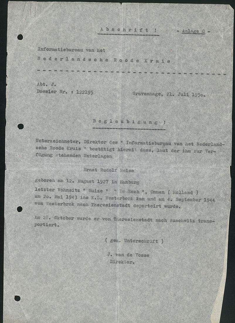 Verklaring van het Ned. Rode Kruis met betrekking tot de deportatie van Ernst Rudolf Reiss naar respectievelijk Westerbork, Theresienstadt en Auschwitz, 1950