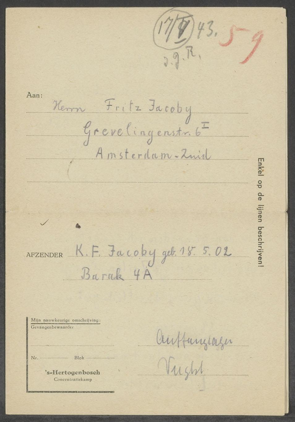 Brief uit kamp Vught van K.F. (Franz) Jacoby (1902-?) aam Fritz Jacoby en zijn familie, 1943