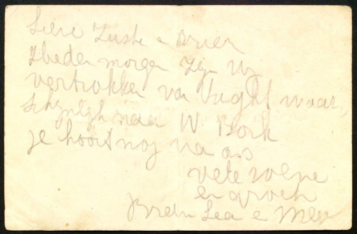Briefkaar van Abraham van de Kar en Lea van de Kar-Leijden van Amstel uit kamp Vught aan de heer W. van Dongen in Den Haag over transport naar Westerbork, 1943