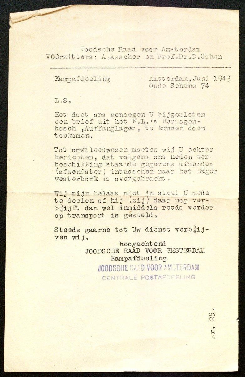 Mededeling van de Joodse Raad dat Abraham van de Kar en Lea van de Kar-Leijden van Amstel vanuit kamp Vught naar Westerbork zijn overgebracht, 1943
