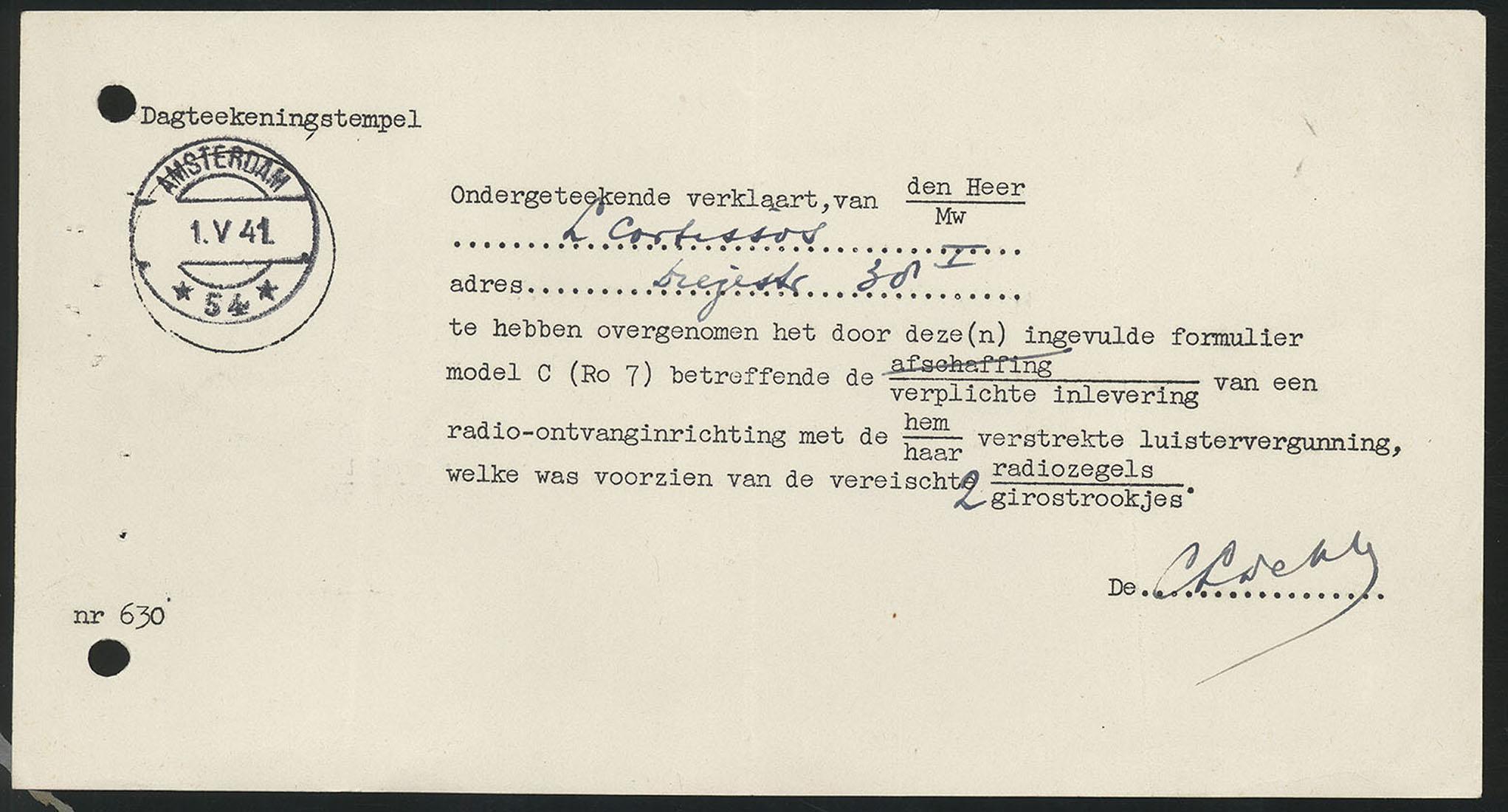 Verklaring van C.L. Dekker dat hij van Louis Cortissos het formulier betreffende verplichte inlevering van een radio heeft overgenomen, 1941