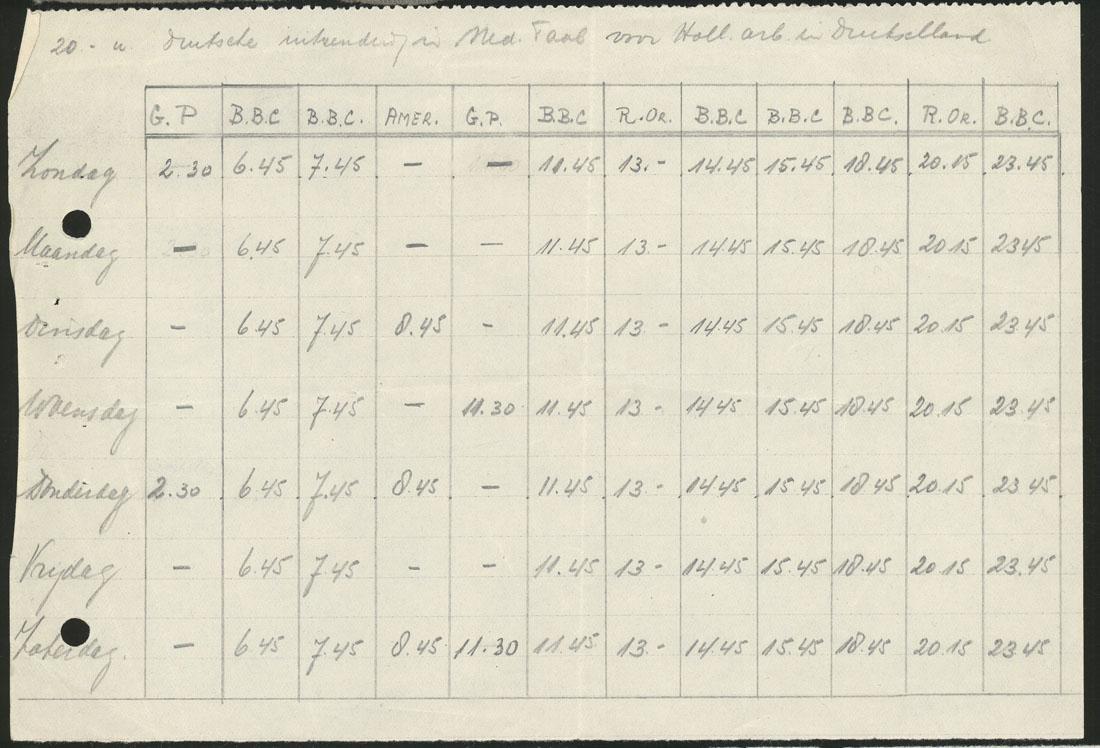Uitzendschema van de radiozenders tijdens de onderduik bijgehouden van Louis Cortissos, ca. 1942-1945