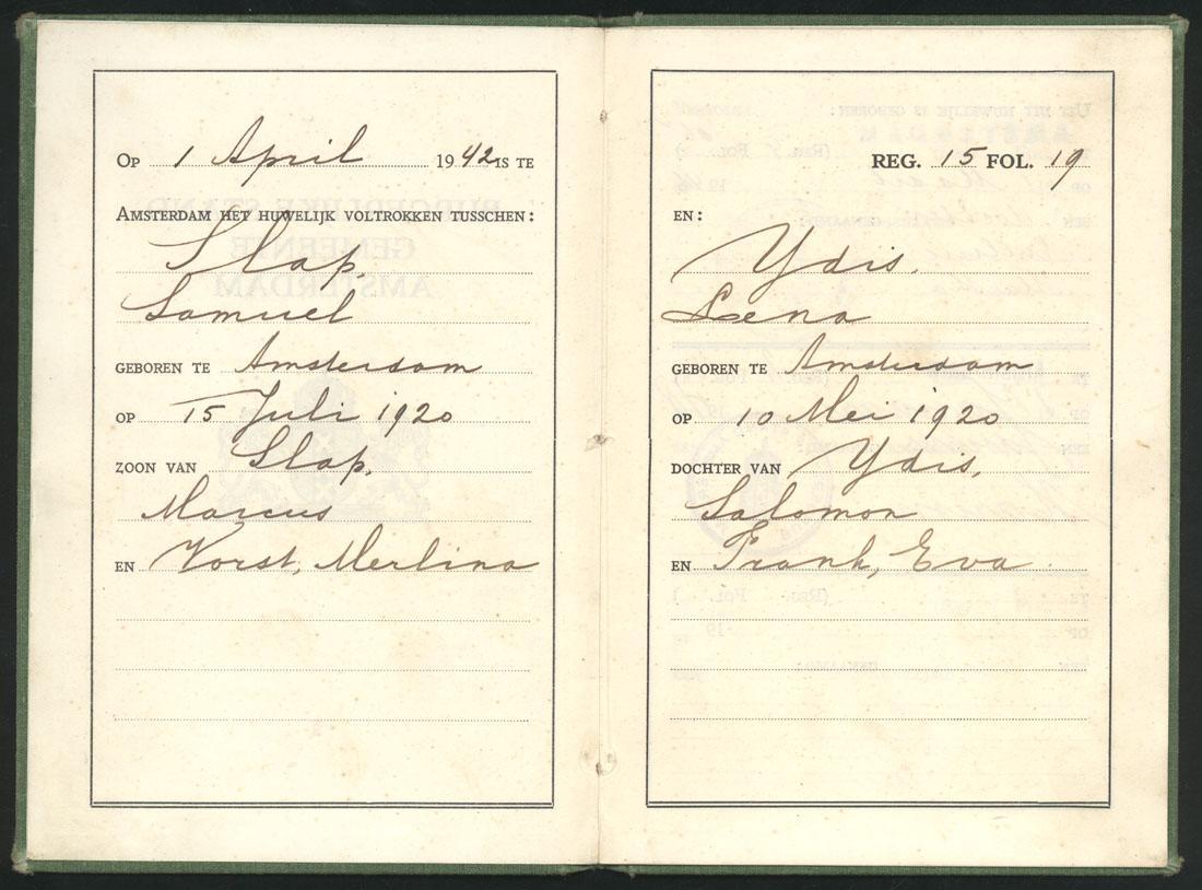 Trouwboekje (1 echt en 1 vals) van Samuel Slap en zijn vrouw Lena Ydis, 1942