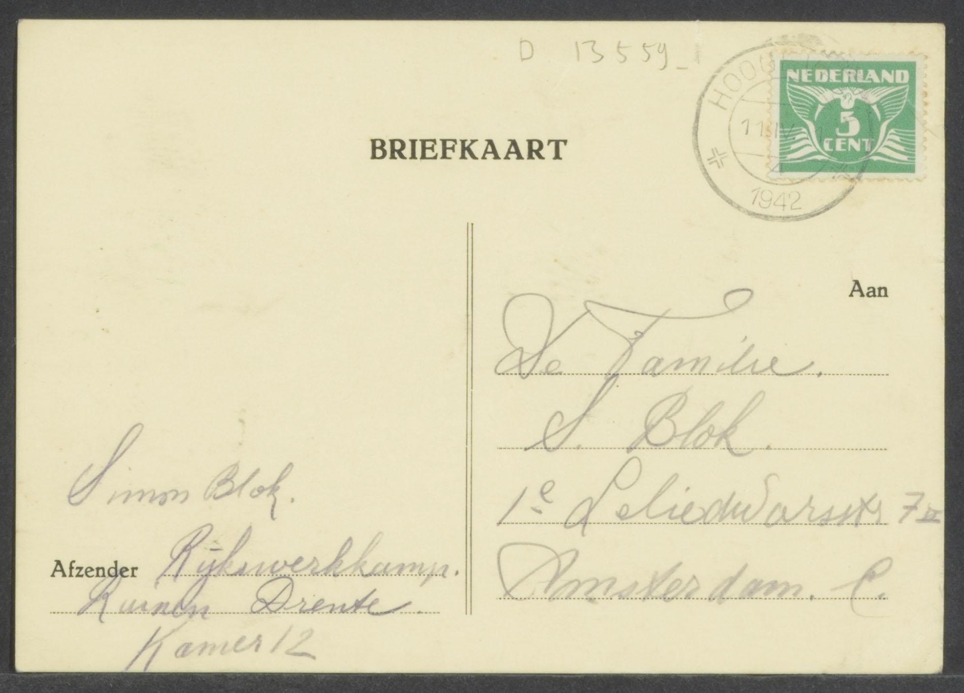 Brieven (19) en briefkaarten (4) van Simon Blok vanuit werkkampen in Ruinen, Hoogeveen en Echten aan zijn ouders in Amsterdam, 1942