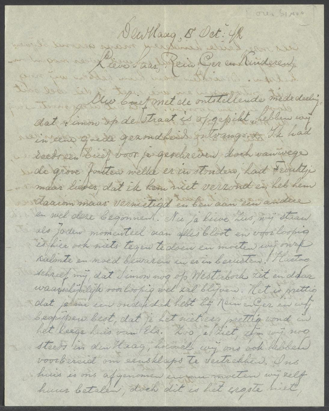 Brief van Frouktje Rozevelt-Muller en haar man Abraham Rozevelt aan Sara van Zuiden-Rozevelt en Rein Tuinder-Blok, Ger Tuinder en kinderen over het oppakken op straat van Simon Blok, 1942