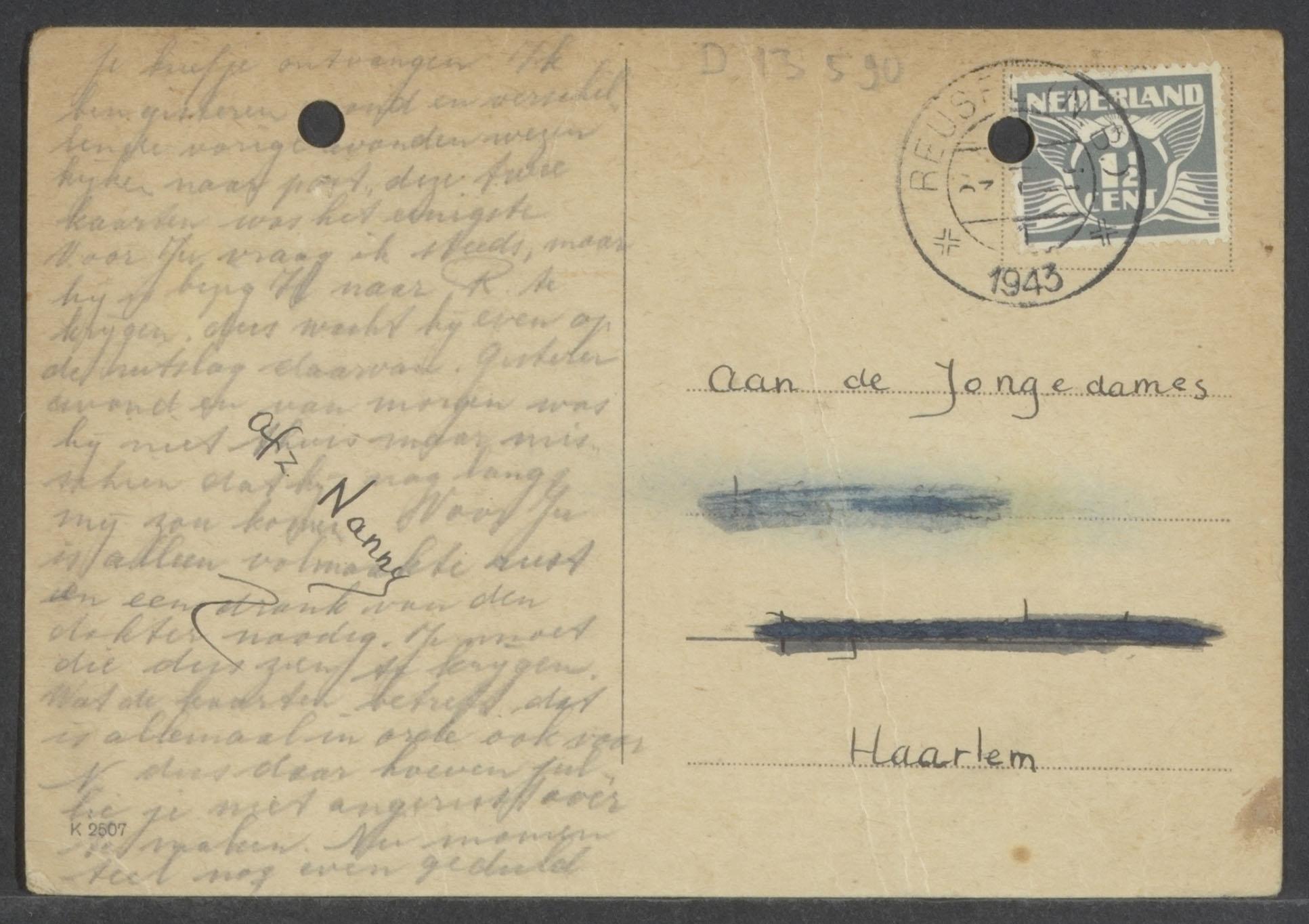 Briefkaart van Nanny Gokkes (onderduiknaam Nanny Donders) vanuit haar onderduikadres in een klooster in Reusel aan haar familie in Haarlem, 1943