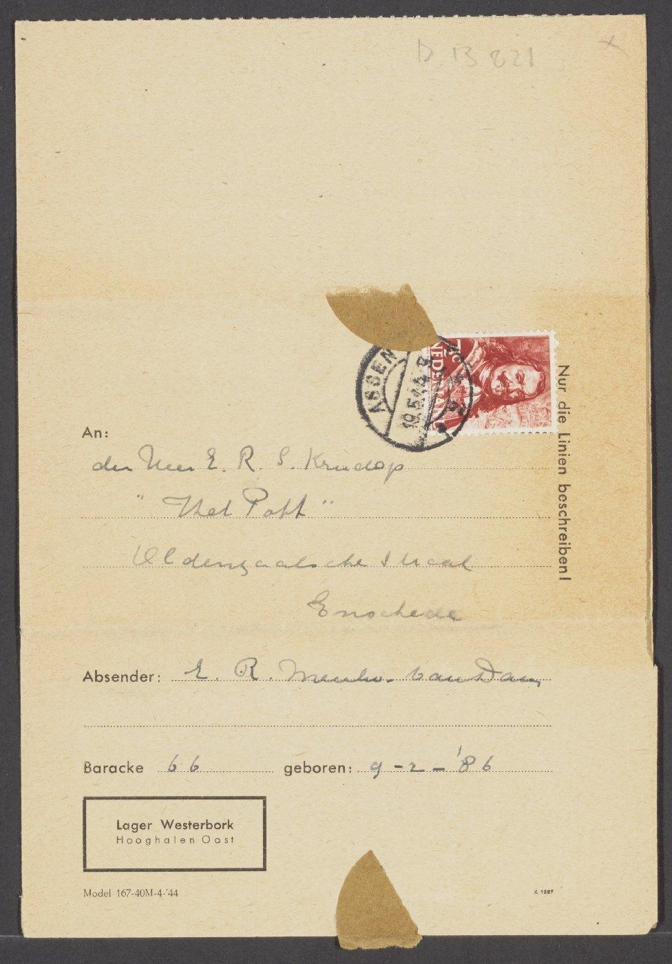 Brief van Emma Rosa Menko-van Dam vanuit kamp Westerbork aan de heer E.R.S. Krudop over het sturen van pakketten, 1944