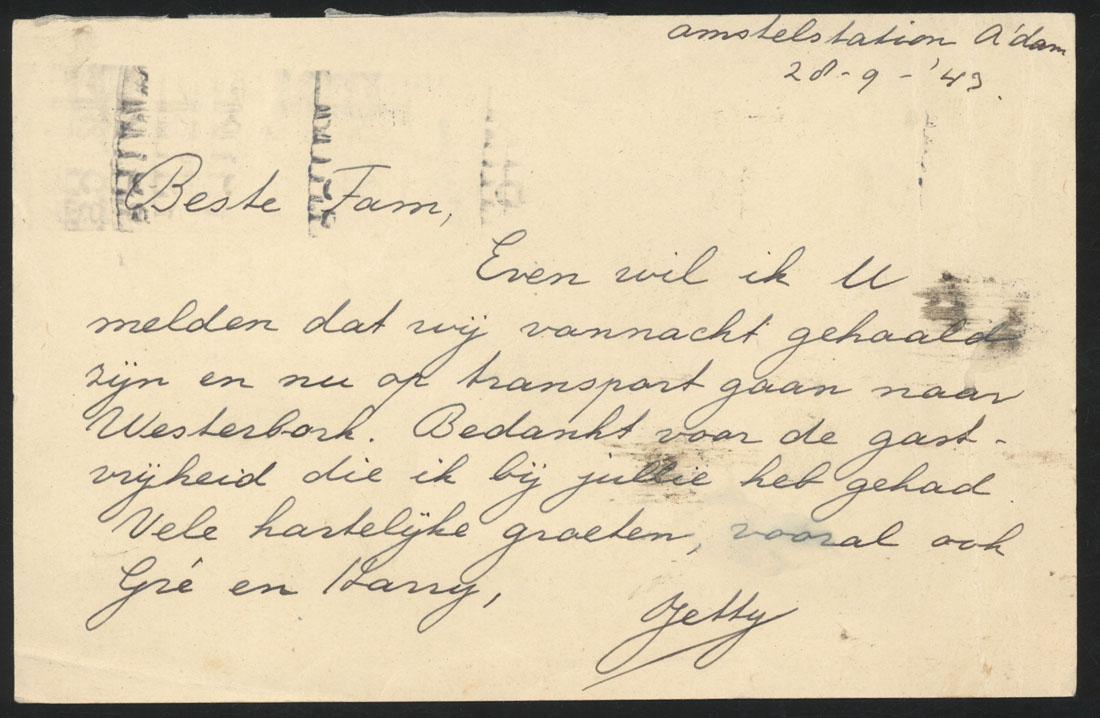 Briefkaart van Judith Kinsbergen vanaf het Amstelstation aan de familie Mommers (= Harry Cohen?) in de MiIlletstraat 47 in Amsterdam met bericht van transport, 1943