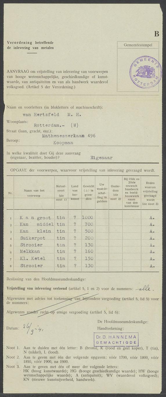 Oorlogsdocumenten (8) met betrekking tot Maurits Hillel van Hertzfeld, 1940-1945
