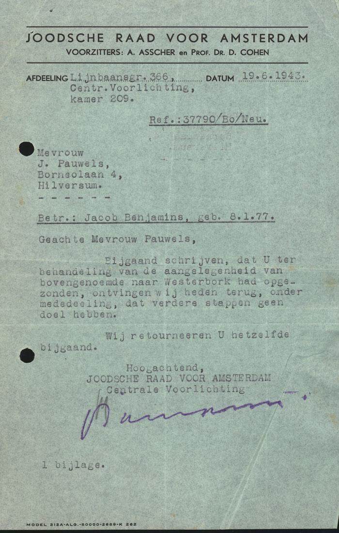 Brieven (2) van de Joodse Raad voor Amsterdam aan mevrouw J. Pauwels en H. Benjamins inzake de verblijfplaats van Jacob Benjamins, 1943